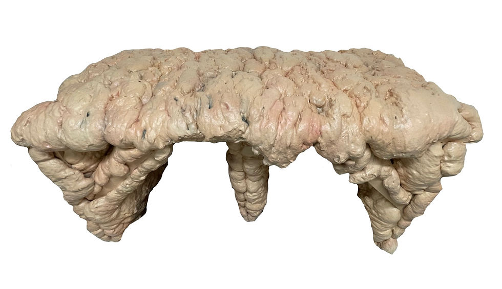 For this piece of work, I have created an interactive gallery bench for audiences, to present ideas of anxiety and the nausea it can cause. By using fleshy tones on the expanding foam on the bench it will appear bodily, while still using ideas of finding discomfort within comfort and this juxtaposition used throughout my whole body of work inspired by Helen Chadwick. The comfort presented by the bench, which is then engulfed in ‘intestines’ presenting ideas that, its hard to find comfort in anything when experiencing anxiety. Even in objects, such as a bench, which is used to find comfort the anxiety never goes it still remains leaving a nauseous feeling – presented by the knotted intestines (expanding foam). This all ties into the idea of using juxtaposition, inspired by Helen Chadwick, to present discomfort in a bodily, interactive, and sculptural way, creating disgust but also interactive and interest for audiences. I chose to use expanding foam due to its similar appearance to intestines (once painted), creating the bodily and grotesque form which I wanted to capture within my work/project. By using a bench to create comfort but also making it uncomfortable to sit on due to the expanding foams texture, further plays into the idea of discomfort caused by anxiety along with personal space and the interactivity of my work. To experience this piece, you have to sit on it, breaking personal space which is a large area of anxiety I have found for many within my research. I find this piece successful within the communication of my message of discomfort through ways of texture, interactivity, and the juxtaposition of materials.